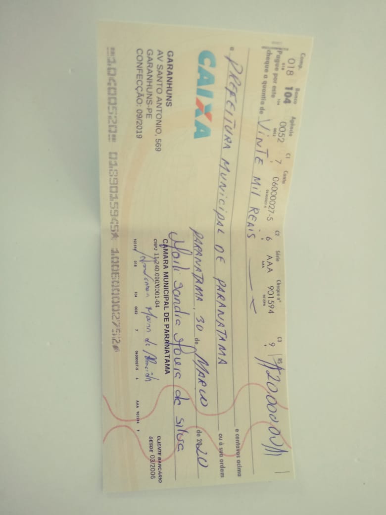 Câmara Municipal de Paranatama, através da presidente da Casa, Marli Sandra Moura, resolveu doar R$ 20 mil reais ao município para ajudar no combate ao coronavírus na cidade.