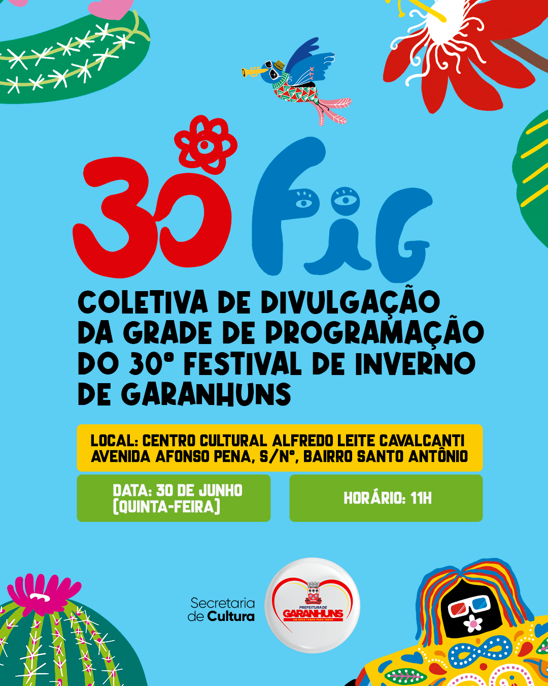 O Governo de Pernambuco, por meio da Secretaria Estadual de Cultura/Fundarpe; a Secretaria Estadual de Turismo e Lazer/Empetur; e a Prefeitura de Garanhuns, por meio da Secretaria Municipal de Cultura, convocam toda a imprensa do Estado.
