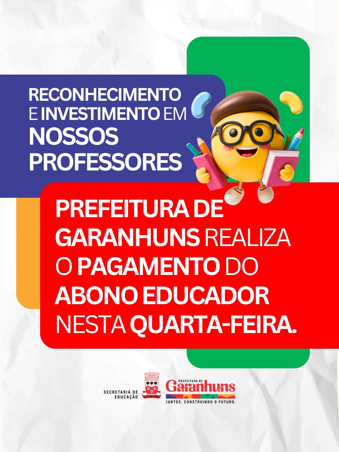 A Prefeitura de Garanhuns, por meio da Secretaria Municipal de Educação, realiza nesta quarta-feira (15) o pagamento do Abono Educador, benefício concedido aos professores efetivos da Rede Municipal de Ensino.