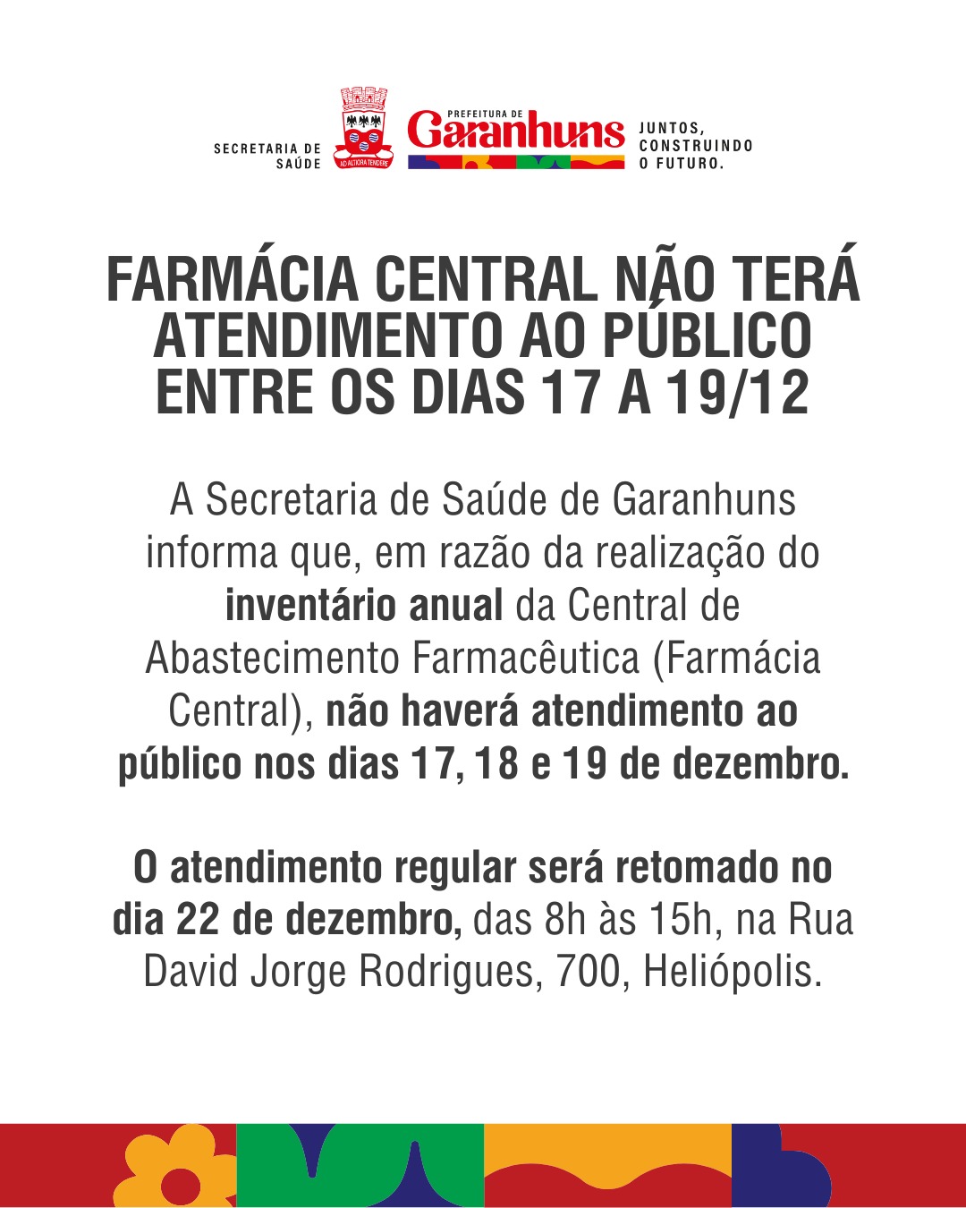 A Secretaria de Saúde de Garanhuns informa que, em razão da realização do inventário anual da Central de Abastecimento Farmacêutica (Farmácia Central), não haverá atendimento ao público nos dias 17, 18 e 19 de dezembro.