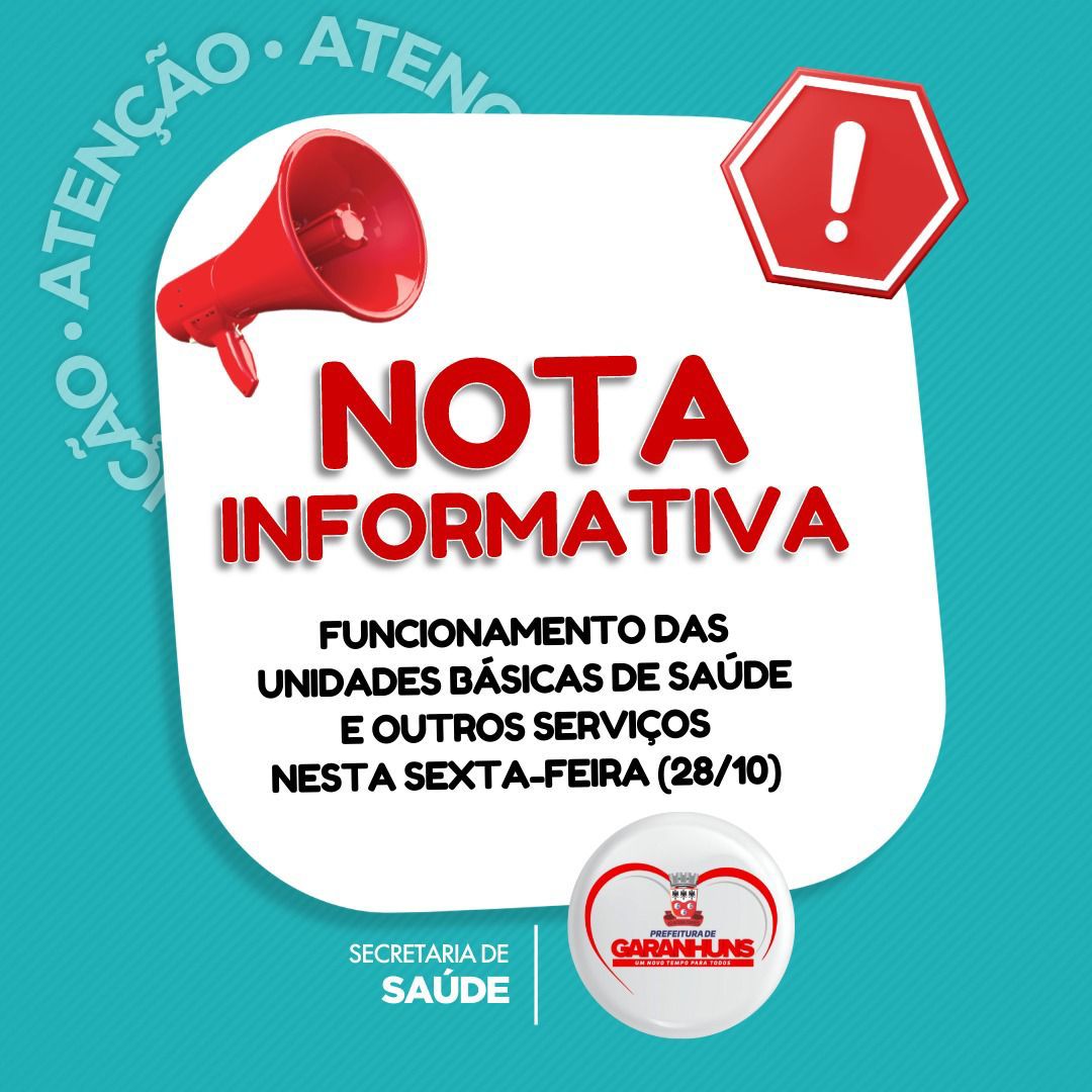 A Secretaria de Saúde de Garanhuns informa que as Unidades Básicas de Saúde e demais serviços da pasta vão funcionar até às 14h nesta sexta-feira (28), em atendimento ao Decreto Municipal nº 047/2022, do Poder Executivo.