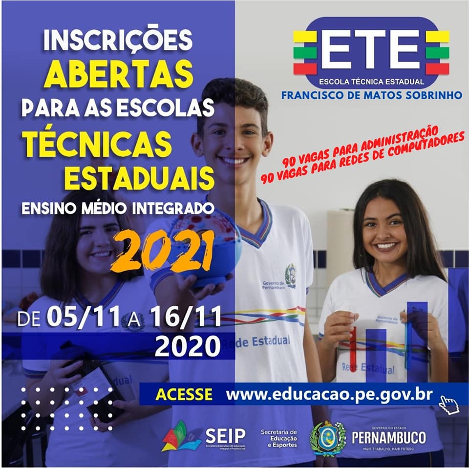 Estão abertas as inscrições para o preenchimento de 8.445 vagas em Cursos Técnicos, ofertados na forma Médio-Integrado à Educação Profissional, em jornada integral, pelas Escolas Técnicas Estaduais (ETEs) de Pernambuco. São 26 cursos disponíveis em diversas áreas de atuação. Destes, seis estão sendo ofertados pela primeira vez.