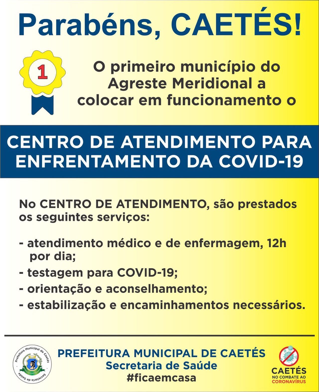 O centro de atendimento ao covid-19 de Caetés está realizando consultas médicas para os pacientes com síndrome gripal e testagem dos pacientes com suspeita de covid -19.