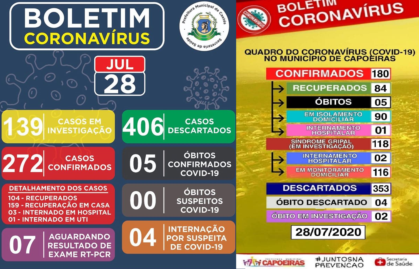 Segundo os Boletins Epidemiológicos divulgados pelas Secretarias de Saúde de Capoeiras e Caetés, nesta terça-feira, 28/07/2020, os dois municípios somam juntos 452 casos de Covid-19. As duas cidades que ficam a uma distância de 5 quilômetros uma da outra, pela aproximação, muitos dos seus moradores circulam entre as duas, diariamente