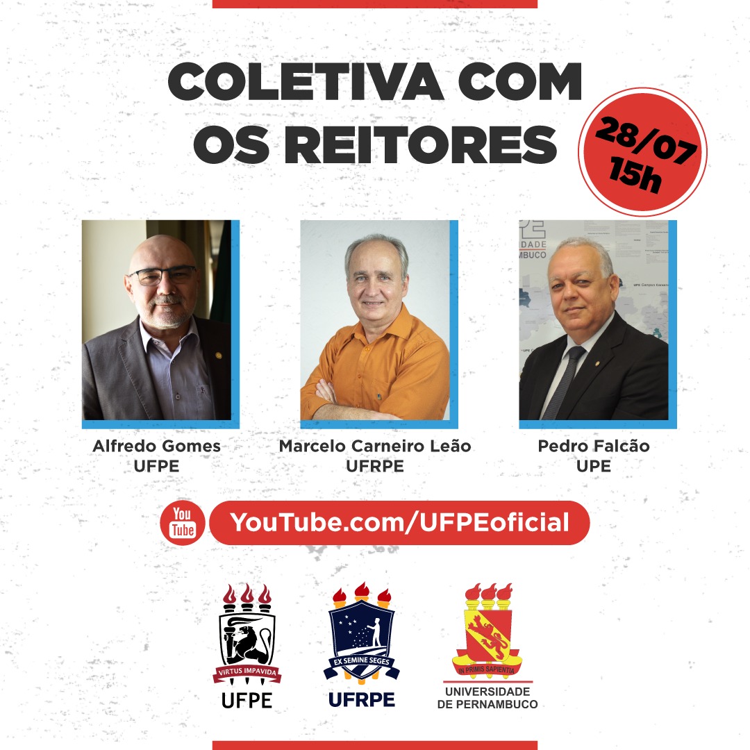 Os reitores da Universidade Federal Rural de Pernambuco (UFRPE), Marcelo Carneiro Leão; da Universidade Federal de Pernambuco (UFPE), Alfredo Gomes; e da Universidade de Pernambuco (UPE), Pedro Falcão; convidam a imprensa para coletiva a ser realizada nesta terça-feira (28), às 15h, no Auditório João Alfredo, localizado no 1º andar da Reitoria da UFPE.